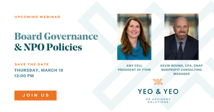 Join Yeo & Yeo Nonprofit Consulting Manager Kevin Bouma, CPA, CNAP, and Amy Cell, President of Yeo & Yeo HR Advisory Solutions, as they share real-world insights into what effective nonprofit boards look like in practice, where organizations commonly get stuck, and how thoughtful governance and policies can reduce risk and support long-term mission success.
