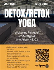 Take some time for yourself, find your breath, destress & detox with yoga with Roo at Wolverine Pickelball. Everyone is welcomed to this light hearted, all level yoga class. Modifications are given, from advanced to beginners. There will be some fascia release added in (balls & explanation provided) - really help decrease tension in the body. It is a wonderful way to spend an evening, connecting with your breath and body, improving your flexibility and mobility. Stay for socializing and a cocktail/mocktail/beer/whatever afterwards.